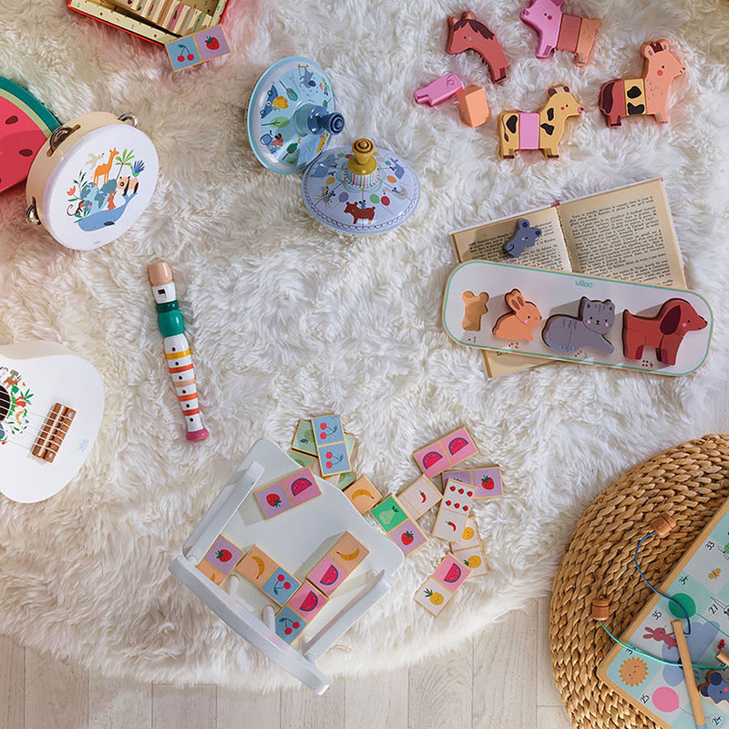 Farverigt dominospil i træ fra Vilac, perfekt til de mindste børn, der er klar til at tage de første skridt ind i spillets verden. Spillet består af 28 solide træbrikker dekoreret med glade og genkendelige frugtmotiver som bananer, jordbær og vandmeloner – alle i bløde farver, der tiltaler de yngste.