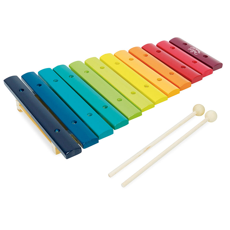En klassisk xylofon i alle regnbuens farver med 2 stikker og 12 tangenter i træ. Xylofonen har en utrolig flot klang, og lyder skønt, når først der er kommet styr på melodierne. En stor og farverige xylofon til de små. Et stykke sjovt og lærerigt legetøj af høj kvalitet, fra det franske legetøjsmærke Vilac.