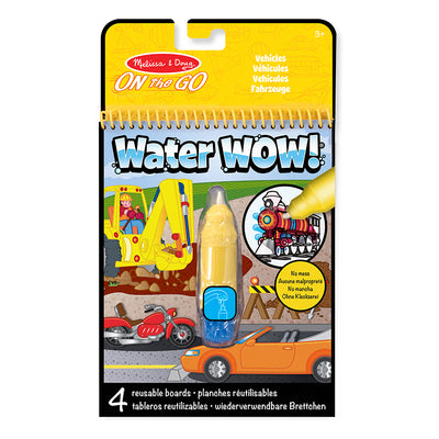 Fantastisk malesæt hvor man slet ikke får farver på hverken hænder eller tøj. Water-wow fra Melissa & Doug, er motiver, der når de males med vand træder frem med farver. Når motiverne begynder at tørre igen, bliver motivskitsen hvid igen, og kan derfor anvendes endnu engang. Blokken indeholder 4 motiver samt en lille tusch som skal påfyldes med vand. Oplagt til køreture, ventetid i lufthavn eller restaurantbesøg. Fra 3 år.